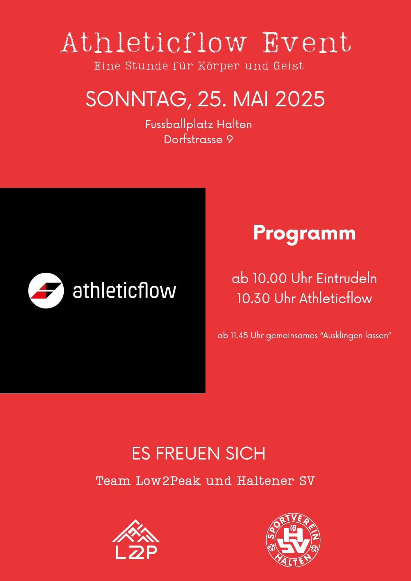 Am Sonntag, 25. Mai, veranstaltet Low2Peak den Spendenanlass «Athletic Flow» auf dem Fussballplatz in Halten.